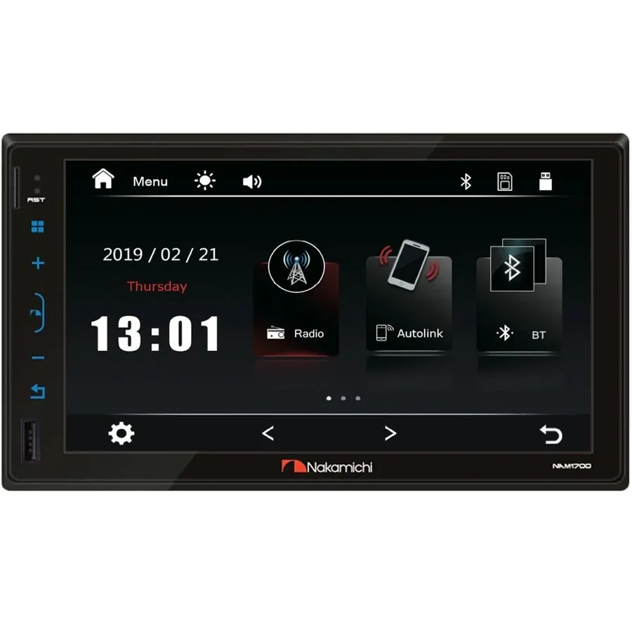 Nakamichi NAM1700 - мультимедийный ресивер формата 2DIN с диагональю экрана 7 дюймов, предназначенный для использования на всех моделях автомобилей*. Этот AV-ресивер обладает самым широким спектром возможностей для воспроизведения аудио видеоконтента с использованием USB-носителей, SD-карт и Bluetooth. Его функция воспроизведения обеспечивает наилучшее качество изображения и звука, благодаря использованию передовых технологий Nakamichi.