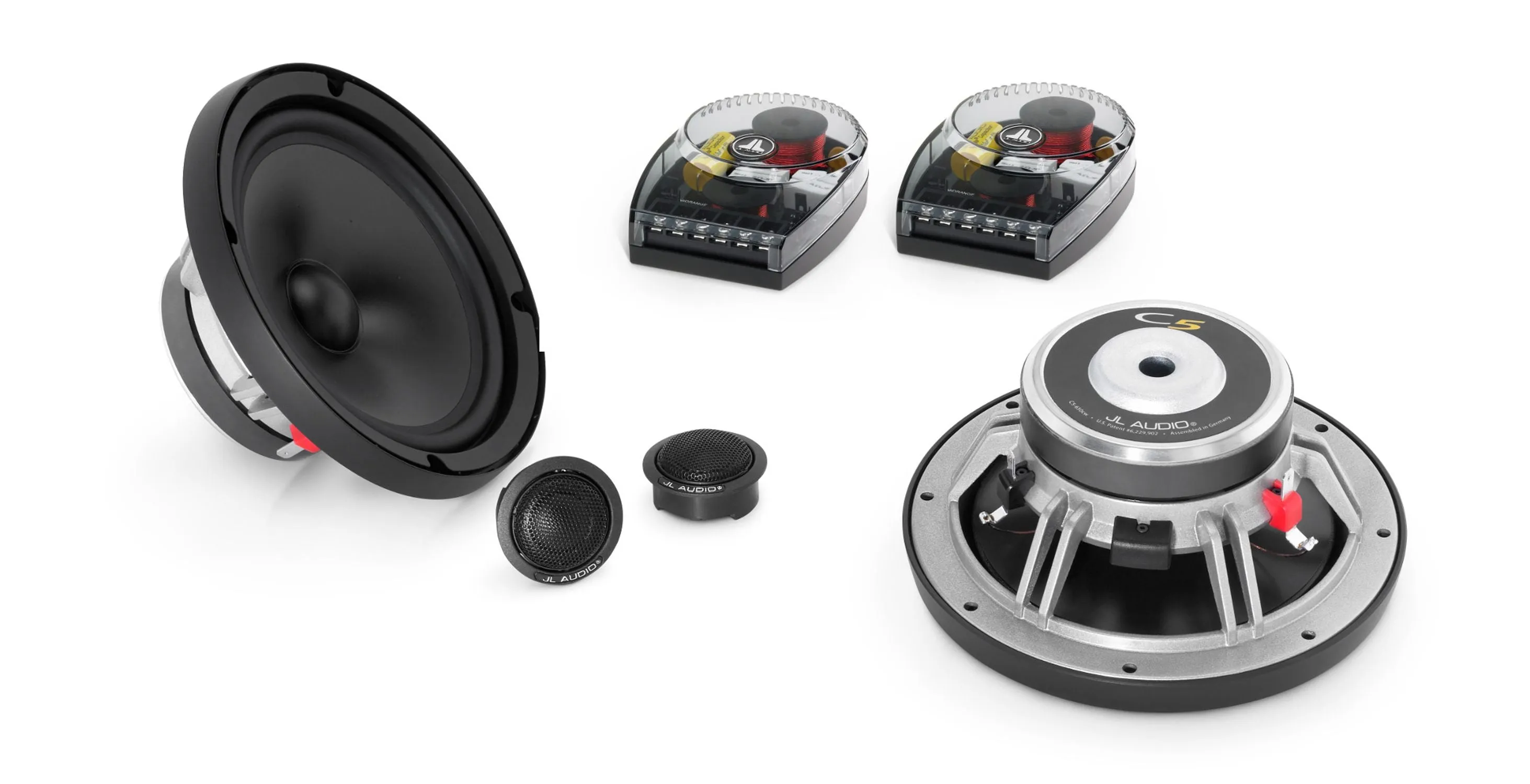 АС созданы с применением самых передовых аудиотехнологий, которые чаще можно встретить только в продукции топ-класса. 165-мм (6.5") НЧ/СЧ-диффузор из полипропилена с минеральными добавками и подвес из бутилкаучука разработаны прославленной немецкой компанией Dr. Kurt Müller & Co. Такие технологии, как оптимизация магнитной системы DMA и усиленная система охлаждения Elevated Frame Cooling, помогают поднять характеристики звучания на недосягаемую высоту. Жесткая и акустически прозрачная корзина из алюминиевого сплава имеет форму, оптимальную для легкой установки в соразмерные штатные места в автомобилях. Удобны в установке также компактные ВЧ-динамики с облегченным 19-мм (0.75") шелковым куполом, сообщающим ясное и гладкое звучание вплоть до верхней отметки 25 кГц. Комплектные аксессуары допускают различные варианты монтажа ВЧ-динамика, в том числе размещение на подиумах, с возможностью ориентации оси излучения (система фиксации RSR, Ratcheting Swivel Rotation).